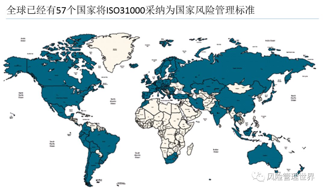 根據(jù)ISO風(fēng)險管理技術(shù)委員會前主席Kevin Knight先生給我提供的統(tǒng)計信息,ISO31000自2009年發(fā)布以來,得到了全球各個國家的支持和響應(yīng)。截至目前,已經(jīng)有57個國家采納了ISO31000風(fēng)險管理標(biāo)準(zhǔn)并在此基礎(chǔ)上發(fā)布了其國家風(fēng)險管理標(biāo)準(zhǔn),如中國的GB/T24353,相信下一步國家標(biāo)準(zhǔn)委也會相應(yīng)地修訂其標(biāo)準(zhǔn)。
