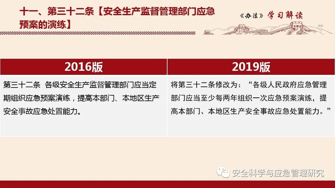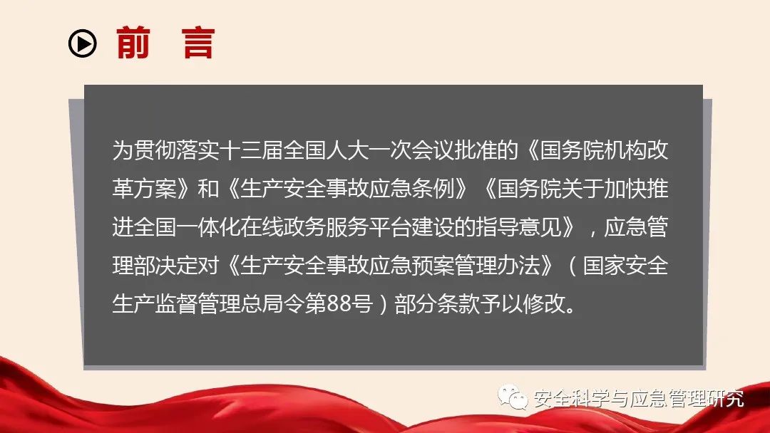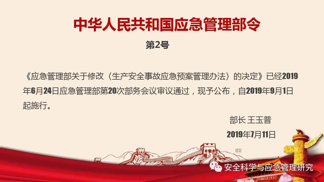 中華人民共和國應(yīng)急管理部令第2號發(fā)布,內(nèi)容是關(guān)于修改原安全監(jiān)管總局88號令《生產(chǎn)安全事故應(yīng)急預(yù)案管理辦法》,一共涉及19條修改,同時將修改后的文本正式發(fā)布!