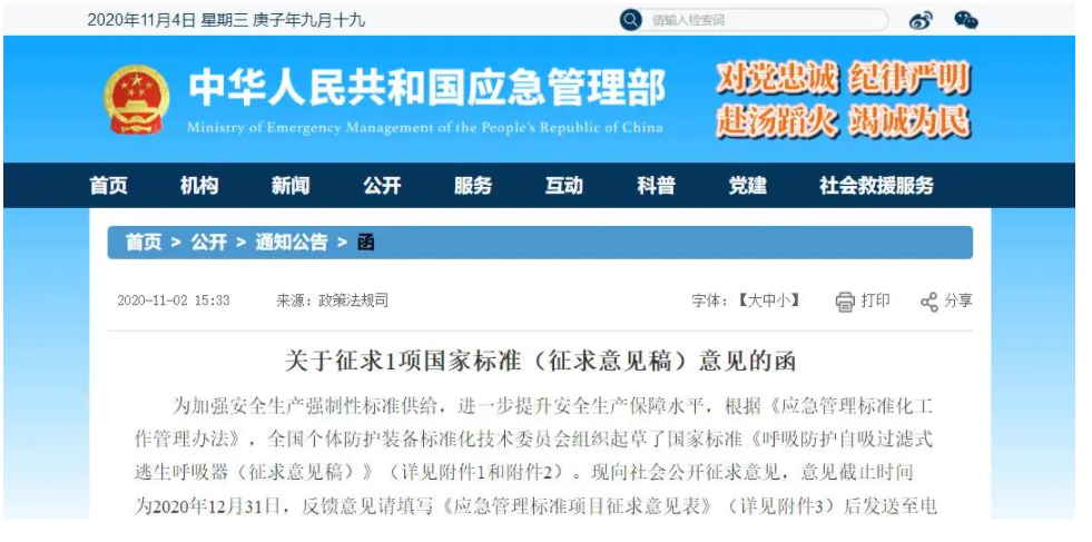 國家標準《呼吸防護自吸過濾式逃生呼吸器(征求意見稿)》公開征求意見