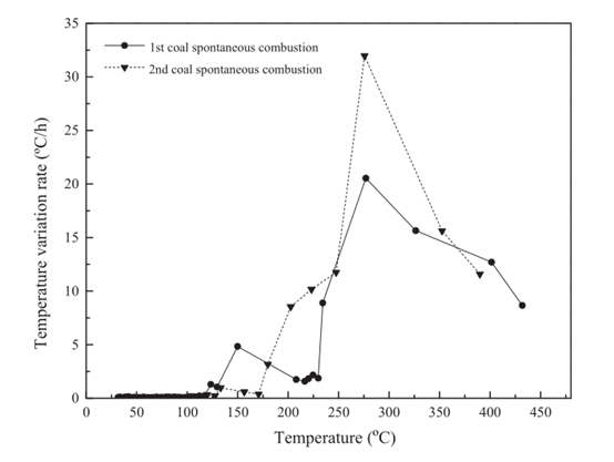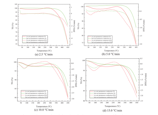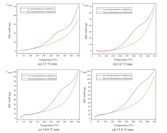 ?加熱速率低時,第二次煤自燃時的質(zhì)量變化在300.0℃之前較小,但在加熱速率高時會明顯降低。此外,在300.0℃之前,煤的質(zhì)量變化率通常高于第一次煤自燃時的質(zhì)量變化率。當(dāng)溫度高于300.0℃時,第二次煤自燃過程中的煤質(zhì)量明顯下降,類似于第一次煤自燃過程中的質(zhì)量。在該階段,當(dāng)加熱速率高時,第二煤自燃期間的煤質(zhì)量變化率較低。然而,當(dāng)加熱速率低時,它變得更高。這與15噸大型煤自燃實驗獲得的結(jié)果非常吻合。此外,第二煤自燃期間的放熱速率低于第一煤自燃期間的放熱速率。