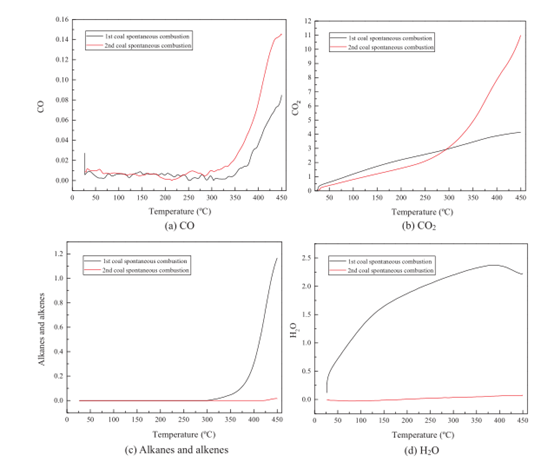 ?在第一次煤自燃期間,CO,CO2,烷烴和烯烴以及H2O的排放隨溫度而大大增加。然而,第二煤自燃過程中烷烴和烯烴以及H2O的釋放隨溫度的升高變化很小。此外,在300.0℃之前,兩個過程之間的CO和CO2量的差異是微不足道的。隨后,第二煤自燃期間的CO和CO2的量隨溫度升高而增加。相反,第二煤自燃期間的烷烴和烯烴以及H2O的量減少。