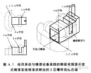 舉一個比較常見的例子:噴漆室的周圍,根據(jù)排風系統(tǒng)的不同來劃分爆炸危險區(qū)域,如下圖。詳情可見GB 14444-2006 《涂裝作業(yè)安全規(guī)程 噴漆室安全技術(shù)規(guī)定》。但是作為一個廠房而言,很有可能只是丙類或者丁、戊類廠房。