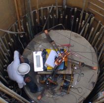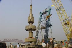 按受力形式樁基可分為端承樁和摩擦樁,前者承載力 主要由樁底巖層提供,后者由樁身穿過土層的豎向摩擦力提供。 樁基施工方法可分為兩大類:灌注樁和沉入樁。 灌注樁施工是先用人工或機(jī)械在土中做成樁孔,然后再把樁身鋼筋籠放入樁孔中,向孔中灌注混凝土而成樁,最后在樁頂澆筑系梁或承臺。若用人工開挖樁孔則稱為挖孔樁,若用機(jī)械挖孔稱為鉆孔樁。 鉆孔樁成孔方法主要有:旋挖鉆機(jī)成孔、正反循環(huán)鉆機(jī)成孔、套管鉆機(jī)成孔、沖擊鉆機(jī)成孔等。 灌注樁施工是先用人工或機(jī)械在土中做成樁孔,然后再把樁身鋼筋籠放入樁孔中,向孔中灌注混凝土而成樁,最后在樁頂澆筑系梁或承臺。若用人工開挖樁孔則稱為挖孔樁,若用機(jī)械挖孔稱為鉆孔樁。 鉆孔樁成孔方法主要有:旋挖鉆機(jī)成孔、正反循環(huán)鉆機(jī)成孔、套管鉆機(jī)成孔、沖擊鉆機(jī)成孔等。 旋挖鉆機(jī)成孔:是由鉆桿帶動鉆頭旋轉(zhuǎn),動力鉆頭正轉(zhuǎn)可低速鉆進(jìn),反轉(zhuǎn)高速甩土,鉆頭旋轉(zhuǎn)將土或砂粒切成碴土,然后快速提出孔外。該法可實(shí)現(xiàn)干法施工,不需用泥漿出碴,環(huán)保性良好,適用于黏土、粉土、砂土、淤泥質(zhì)土以及部分卵石碎石地層等。 沖擊鉆機(jī)成孔:沖擊鉆機(jī)是用卷揚(yáng)機(jī)等設(shè)備將帶刃的重鉆頭或沖抓提高,然后放開卷揚(yáng)機(jī),鉆頭落下,切削壓碎孔底巖土??梢园雁@頭提出孔口后用出碴筒出碴,亦可用泥漿循環(huán)法出碴。沖擊鉆孔適用范圍較廣,黏土、粉砂、卵石層均適用。 套管鉆機(jī)成孔:是在鉆孔的同時,用機(jī)械晃動壓入一鋼制套管。套管作用是防坍孔,孔中用重錘式抓斗機(jī)除土。成孔后放入鋼筋籠,然后在灌注樁身砼時,逐步將套管拔出。套管鉆孔法適用于非巖層的履蓋土層中,對坍孔防護(hù)作用好,可在已有建筑附近施工。 工作程序 正反循環(huán)鉆機(jī)成孔:依靠鉆頭旋轉(zhuǎn)鉆進(jìn),用泥漿循環(huán)進(jìn)出鉆孔浮起并將鉆碴帶出鉆孔實(shí)現(xiàn)出碴。按照泥漿循環(huán)方法可分為:正循環(huán)和反循環(huán)兩種。反循環(huán)比正循環(huán)法出碴效率高。 泥漿同時起到護(hù)壁(平衡孔內(nèi)水壓力),防止坍孔和浮碴的作用。泥漿由黏土或膨脹土加外加劑組成,泥漿比重一般在1.1~1.3間。 橋址處地質(zhì)條件為粉、細(xì)、中、粗砂層及少量砂礫層。橋梁基礎(chǔ)為混凝土鉆孔灌注樁,每橋墩為4根φ3.0m鉆孔樁,橫橋向樁距10.0m,順橋向樁距9.0m,樁長91.0m。考慮到雨季時河床沖刷嚴(yán)重,鉆孔樁上部有鋼護(hù)筒,橋墩樁鋼護(hù) 筒設(shè)計(jì)為直徑φ3.0m,護(hù)筒長52m。 特點(diǎn): 從永久鋼護(hù)筒底口鉆孔開始至混凝土填充至永久鋼護(hù)筒底口不得超過73小時(39m樁長)??椎壮敛旰穸龋嚎椎字辽?0%橫截面上沉碴厚度<15mm,孔底截面任何位置沉碴厚度≯40mm。樁底壓漿:為了鋼筋籠底部的壓漿管路盡可能貼近孔底而又不被損壞,在鋼筋籠底部安裝有觸底指示燈開關(guān)。 施工流程1 施工流程2 鋼護(hù)筒制造與安裝 橋墩鋼護(hù)筒直徑3.0m,長52m,板厚25mm。護(hù)筒在鋼結(jié)構(gòu)廠制造,用卷板機(jī)成型,在旋轉(zhuǎn)胎架上用自動電焊機(jī)焊接。一般分為四節(jié)出廠,用平板拖車或牽引車運(yùn)輸?shù)浆F(xiàn)場?,F(xiàn)場采用手工焊拼接,所有焊縫都要經(jīng)過超聲波探傷檢查。 橋墩樁入土60m~66m,采用預(yù)鉆孔方法埋設(shè)。首先安裝φ3.4m臨時護(hù)筒,臨時護(hù)筒入土深度10m左右,然后安裝 鉆機(jī),鉆頭直徑φ3.15m~φ3.22m,鉆孔至-49m標(biāo)高,鋼護(hù)筒底口設(shè)計(jì)標(biāo)高為-50m,留1m用APE震動錘震打到位。 鋼護(hù)筒卷制 鋼護(hù)筒在旋轉(zhuǎn)臺架上焊環(huán)向接縫 鋼護(hù)筒運(yùn)輸 安裝鋼護(hù)筒入孔 現(xiàn)場焊接接高鋼護(hù)筒 振動下沉至設(shè)計(jì)標(biāo)高 鋼筋籠制造與安裝 橋墩樁鋼筋籠長度94.5m,鋼筋籠重量約150t主筋φ36mm,箍筋φ20mm。部分?jǐn)嗝鏋殡p層鋼筋籠,同一斷面鋼筋數(shù)量最多達(dá)240根,鋼筋密集。 鋼筋籠內(nèi)側(cè)沿圓周均布6根φ50mm鋼管,用于超聲波檢測樁身混凝土的灌注質(zhì)量。 鋼筋籠內(nèi)布置循環(huán)注漿管路,用于樁底壓漿以增加樁底承載力。注漿管采用12根φ25mm鋼管,底部連接形成6條壓漿回路。每回路底部安裝兩個套筒部件,每個套筒內(nèi),鋼管上設(shè)置兩個直徑6mm,被橡膠套筒緊密包裹的出漿孔,出漿孔口朝下。 鋼筋籠在長線臺座上制作,分為4節(jié)進(jìn)行安裝,在各節(jié)鋼筋籠接頭處應(yīng)做好標(biāo)記,以便安裝時對應(yīng)拼接。主筋接長采用搭接,每個搭接接頭采用2個“U”型卡連接。 鋼筋籠吊入樁孔后,懸掛在鋼護(hù)筒頂口,按分節(jié)順序進(jìn)行拼接,逐節(jié)下放,最終的鋼筋籠懸掛在護(hù)筒頂口。 為保證出漿孔緊貼樁底,在鋼筋籠底部安裝3個觸底指示燈開關(guān),電線引出孔口,鋼筋籠下端接近護(hù)筒底口時,應(yīng)放慢下放速度,當(dāng)注漿管緊貼樁底時,指示燈發(fā)亮,停止鋼筋籠下沉,防止損傷底部注漿管。 制造胎模上安放鋼筋 安裝內(nèi)層主筋 保護(hù)層輪片 底部觸底開關(guān) 鋼筋籠制作全景 鋼筋籠吊離制造胎模 鋼筋籠運(yùn)輸 吊機(jī)豎起鋼筋籠 鋼筋籠節(jié)段孔口拼裝 鉆孔樁施工 鉆孔施工采用KPG-3000型液壓鉆機(jī