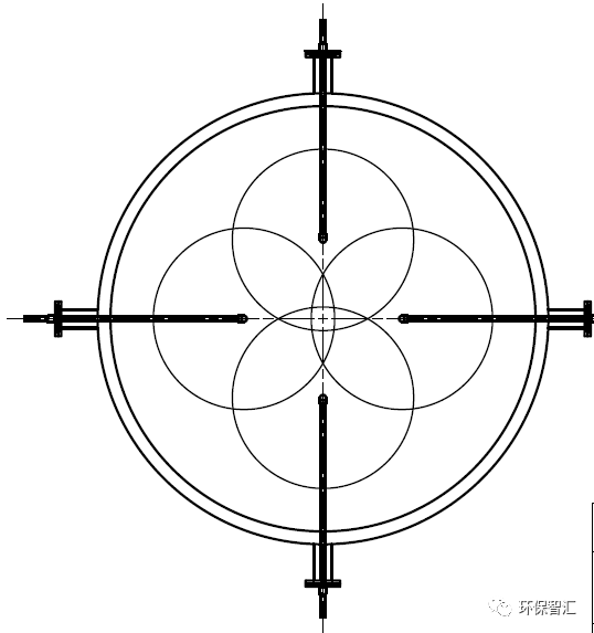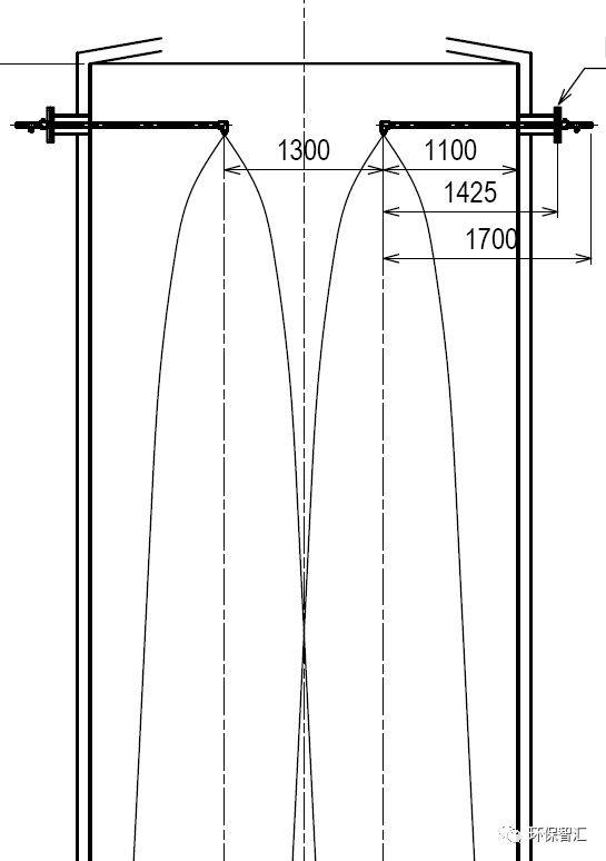 噴嘴的角度、噴槍與噴嘴的角度、噴槍的長(zhǎng)度,應(yīng)根據(jù)噴槍的數(shù)量、增濕塔的直徑、高度、塔內(nèi)風(fēng)速合理設(shè)計(jì)。有條件的應(yīng)進(jìn)行模擬確定,避免噴槍角度不合理,造成噴水淋壁,導(dǎo)致塔內(nèi)濕壁現(xiàn)象發(fā)生。附件為米凱利科技(北京)有限公司為急冷塔噴槍布置所做的模擬。(如圖二)