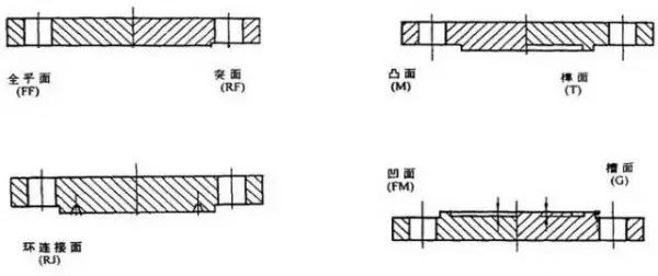 突面(RF)、凹面(FM),凸面(M)、榫面(T),槽面(G),全平面(FF)。