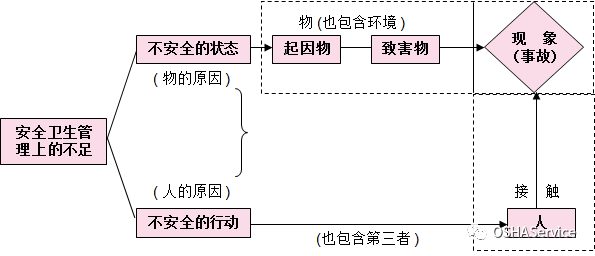 指企業(yè)職工在生產(chǎn)勞動(dòng)過程中,發(fā)生的人身傷害、急性中毒。而事故之所以發(fā)生,是由于人的不安全行為和物的不安全狀態(tài)的異常接觸。如下圖: