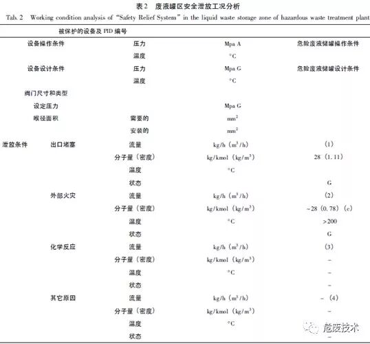 在設(shè)計(jì)緊急泄放系統(tǒng)時(shí),首先進(jìn)行泄放工況分析,包括出口堵塞、外部火災(zāi)、化學(xué)反應(yīng)、閥門失效、以及其他各類事故工況。計(jì)算出各工況的泄放量,并比較選出最大值。再以此值為依據(jù),進(jìn)行泄放閥的選型計(jì)算。根據(jù)危廢處理廠實(shí)際工藝系統(tǒng),選取事故工況分析,具體過程見表2(公眾號(hào):chinawaste)。