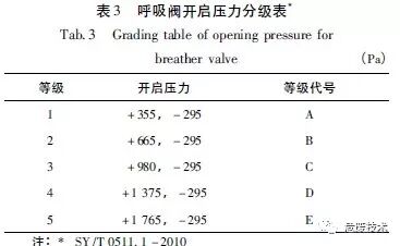 根據(jù)SY/T0511.1,呼吸閥的開啟壓力等級(jí)分為五級(jí),如表3所示。