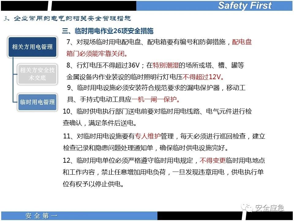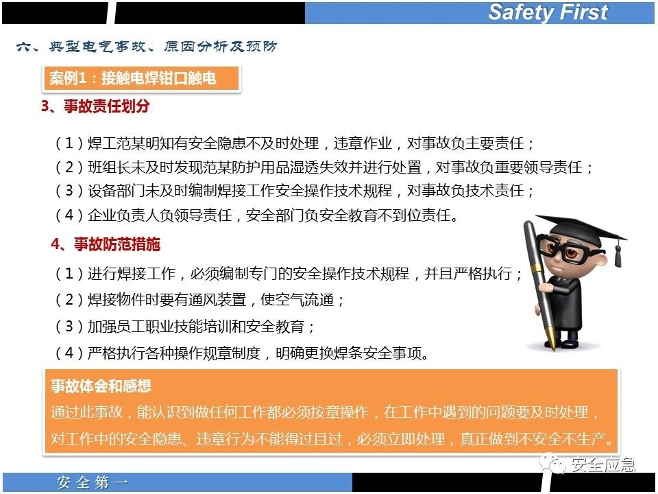 案例73 事故案例73:某35變電站準(zhǔn)備10kV避雷器試驗(yàn)。作業(yè)人員會(huì)同運(yùn)行人員準(zhǔn)備查看設(shè)備實(shí)際情況,拆卸10kV開關(guān)柜背板螺栓,打開了柜門上的電磁鎖,并打開了后柜門后,作業(yè)人員探頭進(jìn)入開關(guān)柜內(nèi)時(shí),對(duì)開關(guān)柜放電。 其它案例見17、18、19、20、21、22、23、50、52。 (27)多組人員組織混亂 案例74 事故案例74:某單位開展500kV線路停電檢修和地線融冰試驗(yàn)。1名工作人員不聽他人勸阻,登塔拆除引流線。隨后開展地線融冰試驗(yàn),該工作人員觸電死亡。 其它案例見45、46、47、48。 (28)交底不認(rèn)真 案例75 事故案例75:某工作負(fù)責(zé)人帶領(lǐng)兩名工作人員準(zhǔn)備在10kV線路裝設(shè)接地線。工作前,工作負(fù)責(zé)人沒有進(jìn)行班前(后)會(huì),沒有分配工作任務(wù),也沒有交代安全注意事項(xiàng),另外兩人也沒有主動(dòng)詢問,相互提醒,導(dǎo)致工作負(fù)責(zé)人無(wú)監(jiān)護(hù)誤登運(yùn)行線路,造成觸電。 其它案例見32。 (29)監(jiān)護(hù)不到位 l 單人工作無(wú)監(jiān)護(hù) 事故案例:36。 l 監(jiān)護(hù)人參與工作 事故案例:11。 l 監(jiān)護(hù)不認(rèn)真,或默許違章行為 事故案例:67。 (30)人員、工作安排不恰當(dāng) 案例76 事故案例76:某供電所安排不具備單獨(dú)工作資格和能力的新入廠員工上桿進(jìn)行配變?cè)O(shè)備搶修工作,由于安全距離不夠,員工經(jīng)驗(yàn)不足,監(jiān)護(hù)不到位,導(dǎo)致觸電。 案例77 事故案例77:某高壓試驗(yàn)班開展定檢預(yù)試作業(yè)。工作負(fù)責(zé)人與工作人員在抄錄放電計(jì)數(shù)器銘牌,另一名剛參加工作不久的工作人員拿著自制試驗(yàn)線插入移動(dòng)電源盤插座內(nèi),然后,用左、右手分別拿住兩個(gè)鱷魚夾準(zhǔn)備對(duì)放電器搭接做試驗(yàn),左、右手習(xí)慣性的分別握住了兩個(gè)鱷魚夾的導(dǎo)體部分,此時(shí)電流通過人體,漏電保護(hù)器沒有動(dòng)作,觸電死亡。 (31)單人作業(yè) l 野外單人巡線、勘察 案例78 事故案例78:某單位開展線路巡視時(shí),單人作業(yè),在被告知“巡視完N58塔后切勿過江,要沿原路返回”的情況下,仍然獨(dú)自一人違規(guī)游泳過江,溺水身亡。 案例79 事故案例79:某單位野外勘察時(shí),某工作人員在未告知工作負(fù)責(zé)人的情況下,獨(dú)自一人返回車輛所在地,途中墜落懸崖暈倒,受輕傷并失蹤12小時(shí)。 附件:最全面的電氣安全培訓(xùn),實(shí)用!