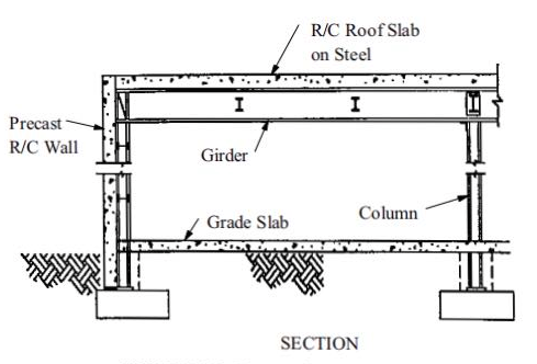 鋼或混凝土框架的預(yù)制混凝土墻,框架抵抗所有垂直載荷;預(yù)制剪力墻抵抗橫向載荷;屋頂通常是金屬甲板上的混凝土板,金屬甲板通過(guò)雙頭螺栓或水坑焊縫固定在鋼框架上;可承受7至10 psi(48至69 kPa)側(cè)向超壓的爆炸載荷。