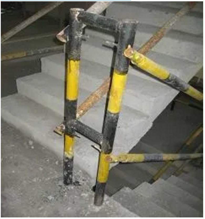 樓梯護(hù)欄設(shè)置要求:采用可拆卸水管護(hù)欄,高度≥1.2m;臨邊超過3m落差的樓梯必須掛網(wǎng)及底部安裝180mm高踢腳板,踢腳板采用≥9mm厚膠合板制作。