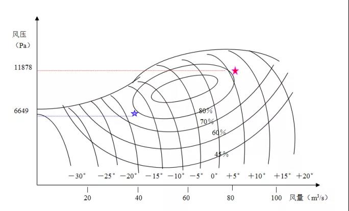 風(fēng)量30~40m3/s(108~144km3/h,130~174t/h),出口風(fēng)壓按不高于7200Pa控制,此時動葉開度應(yīng)在≯33%左右;