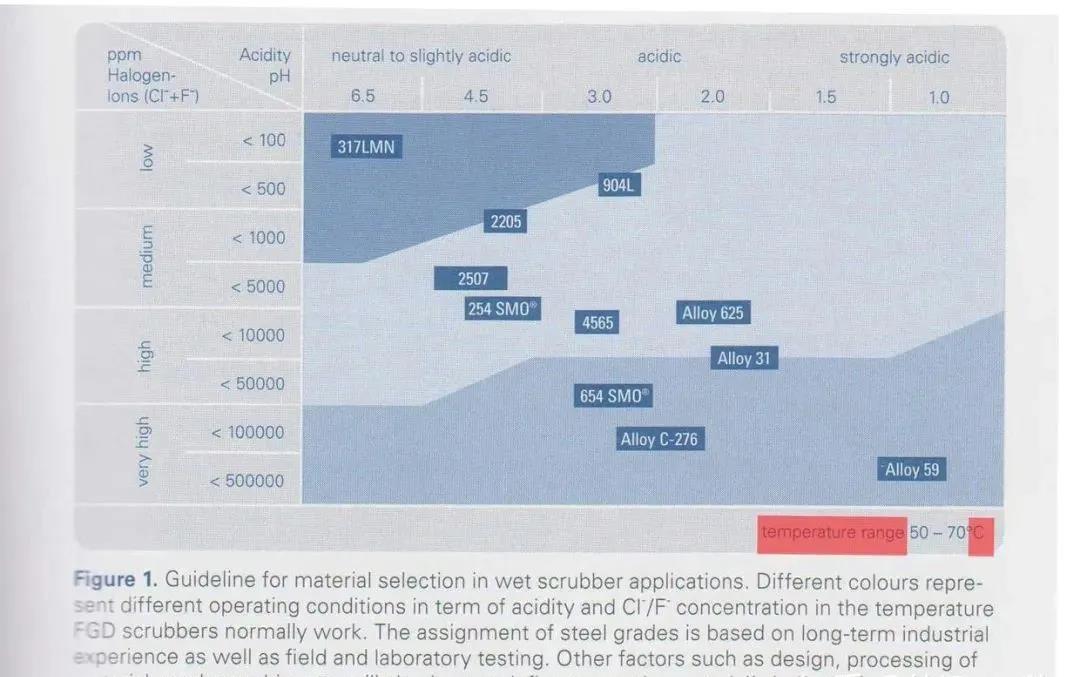 下圖更直觀,50~70度溫度下,按照酸堿性和氯離子濃度直接找到對(duì)應(yīng)材料即可。