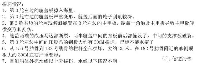 事故導(dǎo)致了百萬美金的巨大損失;幸運(yùn)的是,事故發(fā)生時沒有任何人員站立在該艙左側(cè)甲板上;可以想象的是:如果當(dāng)時有人站立在左側(cè),則很難幸免!