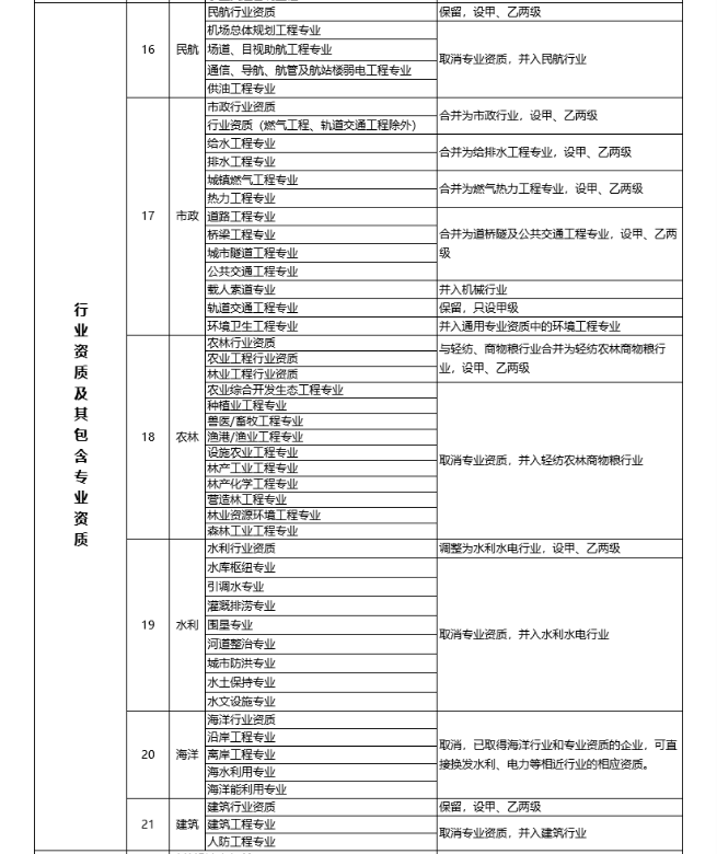 其中,冶金行業(yè)與建材行業(yè)合并為冶金建材行業(yè)資質(zhì),輕紡行業(yè)、農(nóng)林行業(yè)、商物糧行業(yè)合并為輕紡農(nóng)林商物糧行業(yè);