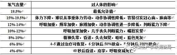 氧氣的正常含量為19.5-23.5%,低于19.5%會(huì)導(dǎo)致人體缺氧窒息。氧氣含量低對(duì)人體的影響如下表2。氧氣的缺少原因有以下幾種:一是空氣的不流通,導(dǎo)致沒有新鮮的空氣進(jìn)入,常發(fā)生與有限空間內(nèi);二是氧氣被化學(xué)燃燒或者生物反應(yīng)所消耗,如汽油的燃燒需要氧氣參與而消耗氧氣、微生物的生物發(fā)酵、呼吸消耗氧氣。饅頭店的蒸汽發(fā)生器是通過燃燒液化石油氣來(lái)產(chǎn)生蒸汽,液化石油氣燃燒需要氧氣參與,會(huì)消耗大量的氧氣,而且蒸制饅頭中會(huì)產(chǎn)生大量高溫蒸汽,蒸汽會(huì)擠占空間氧氣,從而導(dǎo)致氧氣含量降低。