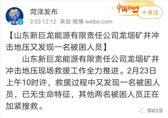 2月23日電 據(jù)菏澤市人民政府新聞辦公室官方微博消息,山東新巨龍能源有限責(zé)任公司龍堌礦井沖擊地壓現(xiàn)場救援工作全力推進。2月23日上午10時許,救援過程中又發(fā)現(xiàn)一名被困人員,已無生命特征,其他兩名被困人員正在加緊搜救。
