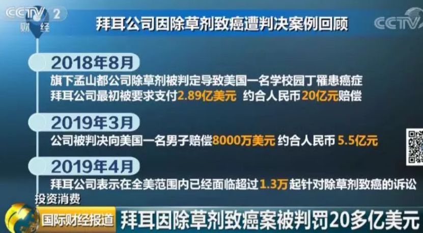 2018年8月,在一起訴訟中,孟山都公司的除草劑被判定導(dǎo)致美國一名學(xué)校園丁罹患癌癥,拜耳公司最初被要求做出2.89億美元,約合人民幣20億元的賠償。