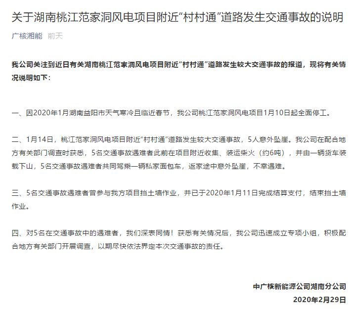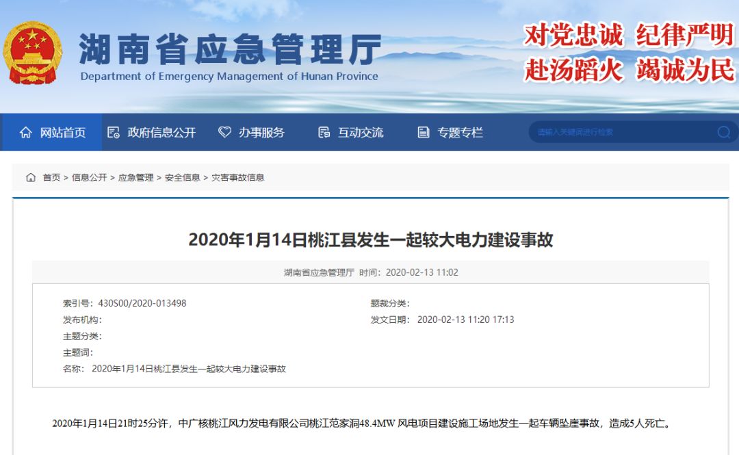 通報顯示,2020年1月14日21時25分許,中廣核桃江風(fēng)力發(fā)電有限公司桃江范家洞48.4MW 風(fēng)電項目建設(shè)施工場地發(fā)生一起車輛墜崖事故,造成5人死亡。
