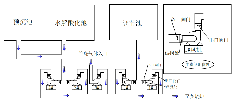 管廊內安裝5臺離心通風機(以下簡稱風機),作用是將滲濾液在預沉池、水解酸化池、調節(jié)池進行預處理過程中產生的臭氣(主要成分為揮發(fā)性脂肪酸、醇類、乳酸、氨、二氧化碳、硫化氫等;因滲濾液的來源、數(shù)量、天氣等原因導致所產生氣體數(shù)量不固定)抽排至焚燒爐。其中,1#、2#風機為調節(jié)池抽氣;3#、4#風機為預沉池和水解酸化池抽氣;5#風機為管廊內抽氣。5臺風機排風管道并聯(lián)安裝在主排風管道上(壓力0.7-1.3kPa之間)。風機24小時運行,把預處理系統(tǒng)產生的臭氣通過主排風管道匯集后排至焚燒爐焚燒。(見下方風機安裝示意圖)