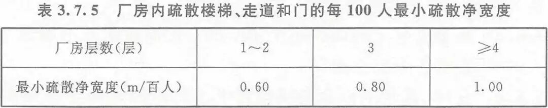 廠(chǎng)房的安全疏散 3.7.1 廠(chǎng)房的安全出口應(yīng)分散布置。每個(gè)防火分區(qū)或一個(gè)防火分區(qū)的每個(gè)樓層,其相鄰2個(gè)安全出口最近邊緣之間的水平距離不應(yīng)小于5m。 3.7.2 廠(chǎng)房?jī)?nèi)每個(gè)防火分區(qū)或一個(gè)防火分區(qū)內(nèi)的每個(gè)樓層,其安全出口的數(shù)量應(yīng)經(jīng)計(jì)算確定,且不應(yīng)少于2個(gè);當(dāng)符合下列條件時(shí),可設(shè)置1個(gè)安全出口: 2. 乙類(lèi)廠(chǎng)房,每層建筑面積不大于150m2,且同一時(shí)間的作業(yè)人數(shù)不超過(guò)10人; 3. 丙類(lèi)廠(chǎng)房,每層建筑面積不大于250m2,且同一時(shí)間的作業(yè)人數(shù)不超過(guò)20人; 4. 丁、戊類(lèi)廠(chǎng)房,每層建筑面積不大于400m2,且同一時(shí)間的作業(yè)人數(shù)不超過(guò)30人; 5. 地下或半地下廠(chǎng)房(包括地下或半地下室),每層建筑面積不大于50m2,且同一時(shí)間的作業(yè)人數(shù)不超過(guò)15人。 3.7.3 地下或半地下廠(chǎng)房(包括地下或半地下室),當(dāng)有多個(gè)防火分區(qū)相鄰布置,并采用防火墻分隔時(shí),每個(gè)防火分區(qū)可利用防火墻上通向相鄰防火分區(qū)的甲級(jí)防火門(mén)作為第二安全出口,但每個(gè)防火分區(qū)必須至少有1個(gè)直通室外的獨(dú)立安全出口。 3.5.5 3.7.4 廠(chǎng)房?jī)?nèi)任一點(diǎn)至最近安全出口的直線(xiàn)距離不應(yīng)大于表3.7.4的規(guī)定。 3.7.5 廠(chǎng)房?jī)?nèi)疏散樓梯、走道、門(mén)的各自總凈寬度,應(yīng)根據(jù)疏散人數(shù)按每100人的最小疏散凈寬度不小于表3.7.5的規(guī)定計(jì)算確定。但疏散樓梯的最小凈寬度不宜小于1.10m,疏散走道的最小凈寬度不宜小于1.40m,門(mén)的最小凈寬度不宜小于0.90m。當(dāng)每層疏散人數(shù)不相等時(shí),疏散樓梯的總凈寬度應(yīng)分層計(jì)算,下層樓梯總凈寬度應(yīng)按該層及以上疏散人數(shù)最多一層的疏散人數(shù)計(jì)算。 首層外門(mén)的總凈寬度應(yīng)按該層及以上疏散人數(shù)最多一層的疏散人數(shù)計(jì)算,且該門(mén)的最小凈寬度不應(yīng)小于1.20m。 3.7.6 高層廠(chǎng)房和甲、乙、丙類(lèi)多層廠(chǎng)房的疏散樓梯應(yīng)采用封閉樓梯間或室外樓梯。建筑高度大于32m且任一層人數(shù)超過(guò)10人的廠(chǎng)房,應(yīng)采用防煙樓梯間或室外樓梯。 倉(cāng)庫(kù)的安全疏散 3.8.1 倉(cāng)庫(kù)的安全出口應(yīng)分散布置。每個(gè)防火分區(qū)或一個(gè)防火分區(qū)的每個(gè)樓層,其相鄰2個(gè)安全出口最近邊緣之間的水平距離不應(yīng)小于5m。 3.8.2 每座倉(cāng)庫(kù)的安全出口不應(yīng)少于2個(gè),當(dāng)一座倉(cāng)庫(kù)的占地面積不大于300m2時(shí),可設(shè)置1個(gè)安全出口。倉(cāng)庫(kù)內(nèi)每個(gè)防火分區(qū)通向疏散走道、樓梯或室外的出口不宜少于2個(gè),當(dāng)防火分區(qū)的建筑面積不大于100m2時(shí),可設(shè)置1個(gè)出口。通向疏散走道或樓梯的門(mén)應(yīng)為乙級(jí)防火門(mén)。 3.8.3 地下或半地下倉(cāng)庫(kù)(包括地下或半地下室)的安全出口不應(yīng)少于2個(gè);當(dāng)建筑面積不大于100m2時(shí),可設(shè)置1個(gè)安全出口。 地下或半地下倉(cāng)庫(kù)(包括地下或半地下室),當(dāng)有多個(gè)防火分區(qū)相鄰布置并采用防火墻分隔時(shí),每個(gè)防火分區(qū)可利用防火墻上通向相鄰防火分區(qū)的甲級(jí)防火門(mén)作為第二安全出口,但每個(gè)防火分區(qū)必須至少有1個(gè)直通室外的安全出口。 3.8.4 冷庫(kù)、糧食筒倉(cāng)、金庫(kù)的安全疏散設(shè)計(jì)應(yīng)分別符合現(xiàn)行國(guó)家標(biāo)準(zhǔn)《冷庫(kù)設(shè)計(jì)規(guī)范》GB 50072和《糧食鋼板筒倉(cāng)設(shè)計(jì)規(guī)范》GB 50322等標(biāo)準(zhǔn)的規(guī)定。 3.8.5 糧食筒倉(cāng)上層面積小于1000m2,且作業(yè)人數(shù)不超過(guò)2人時(shí),可設(shè)置1個(gè)安全出口。 3.8.6 倉(cāng)庫(kù)、筒倉(cāng)中符合本規(guī)范第6.4.5條規(guī)定的室外金屬梯,可作為疏散樓梯,但筒倉(cāng)室外樓梯平臺(tái)的耐火極限不應(yīng)低于0.25h。 3.8.7 高層倉(cāng)庫(kù)的疏散樓梯應(yīng)采用封閉樓梯間。 3.8.8 除一、二級(jí)耐火等級(jí)的多層戊類(lèi)倉(cāng)庫(kù)外,其他倉(cāng)庫(kù)內(nèi)供垂直運(yùn)輸物品的提升設(shè)施宜設(shè)置在倉(cāng)庫(kù)外,確需設(shè)置在倉(cāng)庫(kù)內(nèi)時(shí),應(yīng)設(shè)置在井壁的耐火極限不低于2.00h的井筒內(nèi)。室內(nèi)外提升設(shè)施通向倉(cāng)庫(kù)的入口應(yīng)設(shè)置乙級(jí)防火門(mén)或符合本規(guī)范第6.5.3條規(guī)定的防火卷簾。