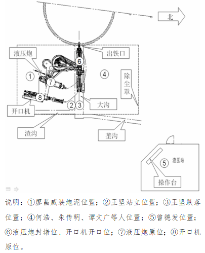 乙班第3爐出鐵結束后,液壓炮操作手曾德發(fā)隨即操作液壓炮移動至出鐵口處進行封堵,7時28分封堵工作完成,曾德發(fā)操作液壓炮退回至設備檢修位置,渣溝工王堅、廖昌威到3#高爐東出鐵口大溝南側,王堅負責清理液壓炮炮嘴,廖昌威負責填裝炮泥,小班長何浩帶領班組人員鐵口工譚文廣、朱傳明在3#高爐東出鐵口大溝北側進行出第4爐鐵水前的準備工作。7時29分何浩未做出移動開口機的指令,但看到開口機從原位移動至大溝位置,此時朱傳明正在出鐵口前進行鋪黃沙作業(yè),何浩立即向曾德發(fā)作出停止操作開口機的手勢,開口機退回原位。7時29分30秒,液壓炮操作工曾德發(fā)在未得到小班長何浩指令的情況下,轉動開口機轉臂,導致開口機突然橫向移動,開口機的轉臂撞到了準備去清理液壓炮炮嘴的王堅,導致其墜入大溝內(nèi)。