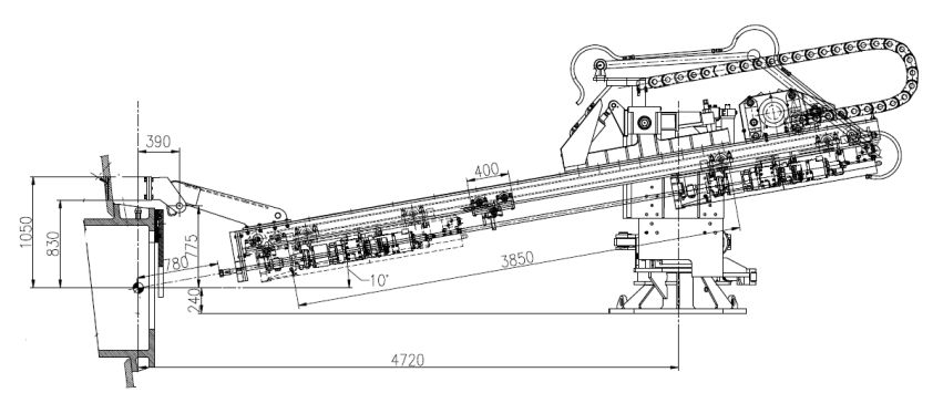 事故設備為桂林市同方機械有限責任公司生產(chǎn)的全液壓開口機,該開口機由固定底座和扇形運轉的轉臂組成,轉臂上裝設有可前后移動的液壓鑿巖機,開鐵口最大深度3500mm,轉臂回轉角度150°,轉臂回轉半徑3740mm。