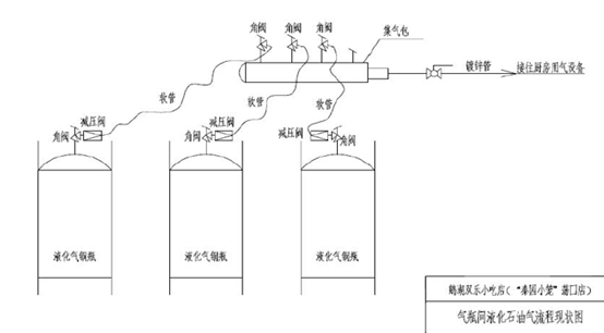 氣瓶間南北向?qū)?.5米,東西向長6米。沿北墻由西向東依次放置冰箱一臺、50Kg空瓶5只(編號為1#、2#、3#、4#、8#);沿南墻由西向東依次設(shè)置油水分離器一套、冰箱一臺、50Kg液化石油氣鋼瓶3只(編號由南向北依次9#、6#、7#)。9#、6#、7#鋼瓶中的液化石油氣通過調(diào)壓閥、燃?xì)庀鹉z軟管連接至集氣包,由集氣包向二樓廚房間送氣。