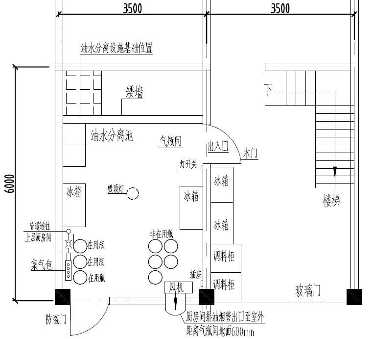 廚房間設(shè)置在氣瓶間樓上(東側(cè)建筑的二樓),南側(cè)由西往東依次擺放:雙眼炒灶、不銹鋼雙層工作臺、蒸煮爐、單頭矮仔爐、湯爐、頂上吊不銹鋼煙罩;東側(cè)由南向北依次擺放:蒸包子爐、不銹鋼水槽等。廚房間內(nèi)燃?xì)忮冧\鋼管從一樓氣瓶間西南角立管延伸至二樓廚房間,沿踢腳線敷設(shè)鍍鋅鋼管,管上裝有6個”三通”,通過“三通”和支管閥門連接燃?xì)庀鹉z軟管直供雙眼炒灶1臺,其他燃器具依次由DN25鍍鋅鋼管(輸氣總管)經(jīng)“三通”及角閥與家用調(diào)壓器連接二次減壓后,分別通到蒸煮爐2臺、單頭矮仔爐2臺、湯爐1臺、蒸包子爐1臺使用。