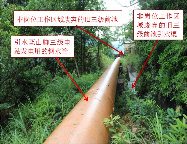 事發(fā)地點區(qū)域屬于從化五指山西北面鄰近105國道的廣州市從化良口五指山電站,坐標為23°43'30.2"N 113°45'05.7"E,山勢東南高,西北低,植被茂盛。海拔高處的一級水庫、二級水庫、舊二級前池(新三級前池)存儲的水,通過鋼水管直接輸送到山腳的三級電站發(fā)電。鋼水管排布經過廢棄的舊二級電站、宿舍區(qū)、非崗位工作區(qū)域的廢棄舊三級前池。
