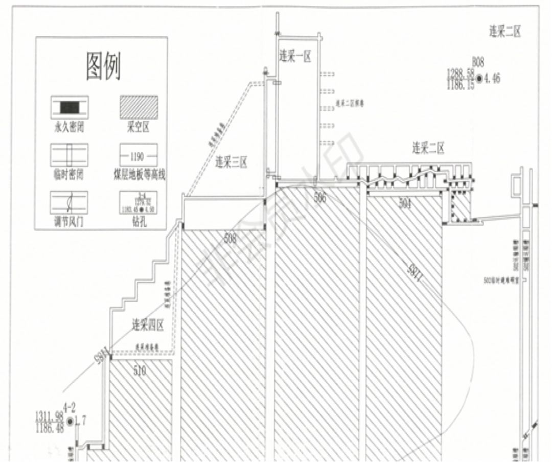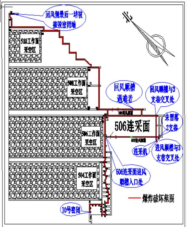 2 使用國(guó)家明令禁止的設(shè)備和工藝。一是506連采工作面主、輔運(yùn)輸車輛均為無(wú)MA標(biāo)志的非防爆柴油無(wú)軌膠輪車,主運(yùn)輸車輛由個(gè)人購(gòu)買,自管自用。二是采用落后淘汰的巷道式開(kāi)采工藝回采邊角煤,以掘代采、以探代采。三是二區(qū)邊角煤開(kāi)采沒(méi)有獨(dú)立的進(jìn)風(fēng)巷,利用506進(jìn)風(fēng)順槽作為進(jìn)風(fēng)巷,垂直于506進(jìn)風(fēng)順槽掘進(jìn)探巷,后退式單翼采硐回采,局扇通風(fēng),串聯(lián)通風(fēng)。四是506連采工作面采用每采2-3個(gè)采硐強(qiáng)制放頂方式,放頂后工作面只有1個(gè)安全出口,工作面風(fēng)流通過(guò)冒落的采空區(qū)回風(fēng)。