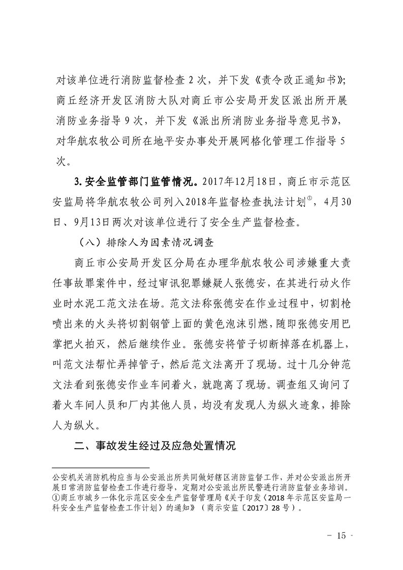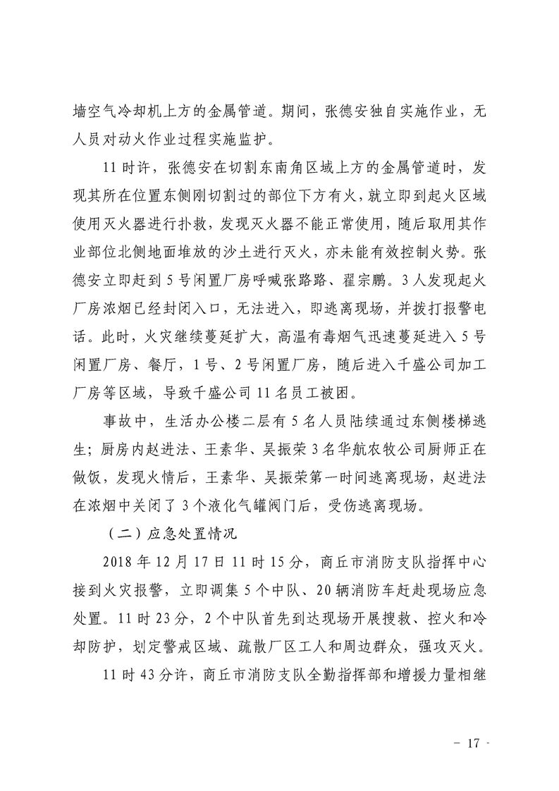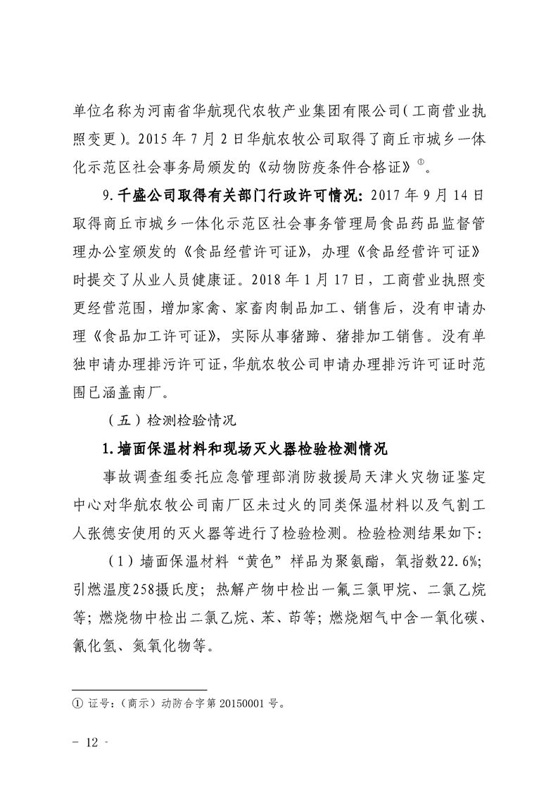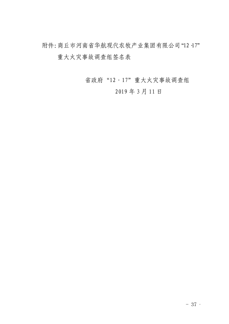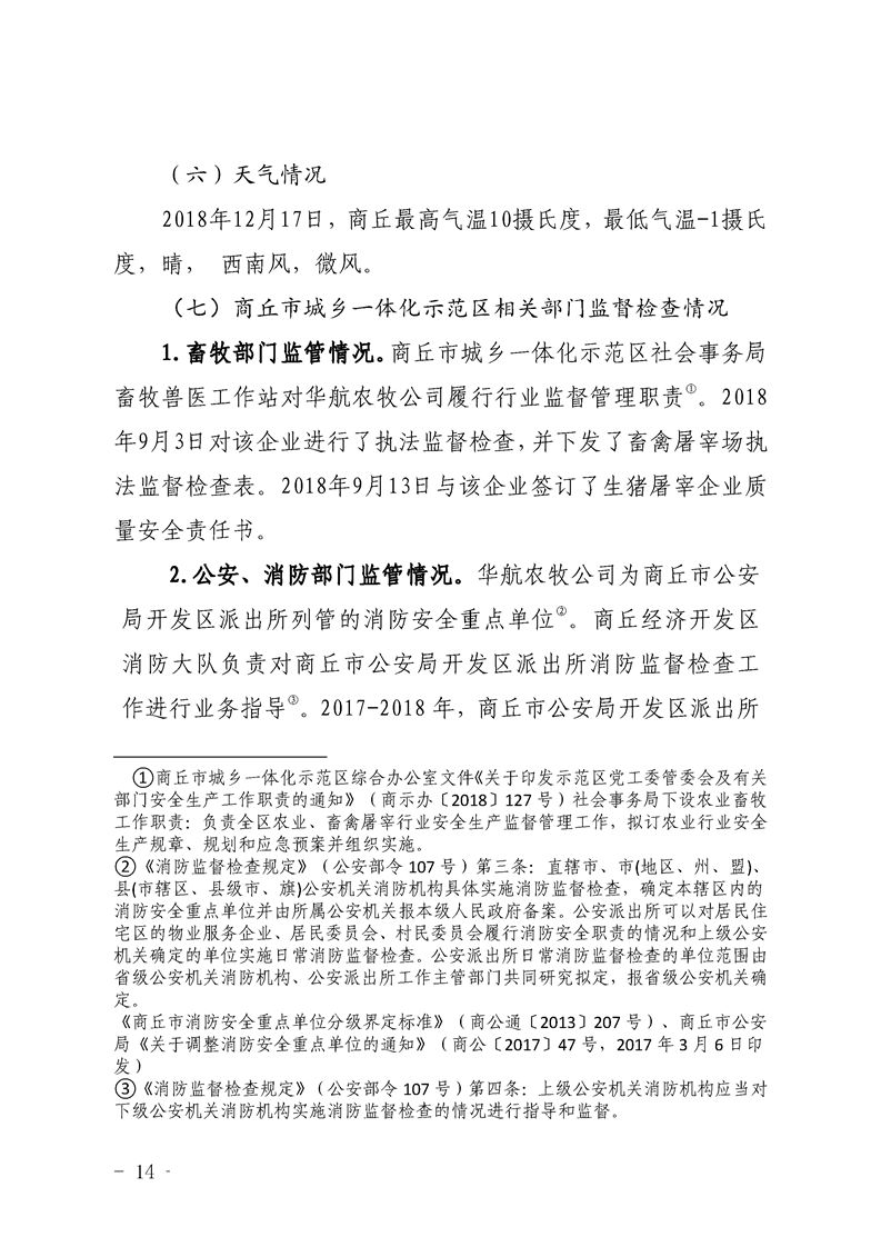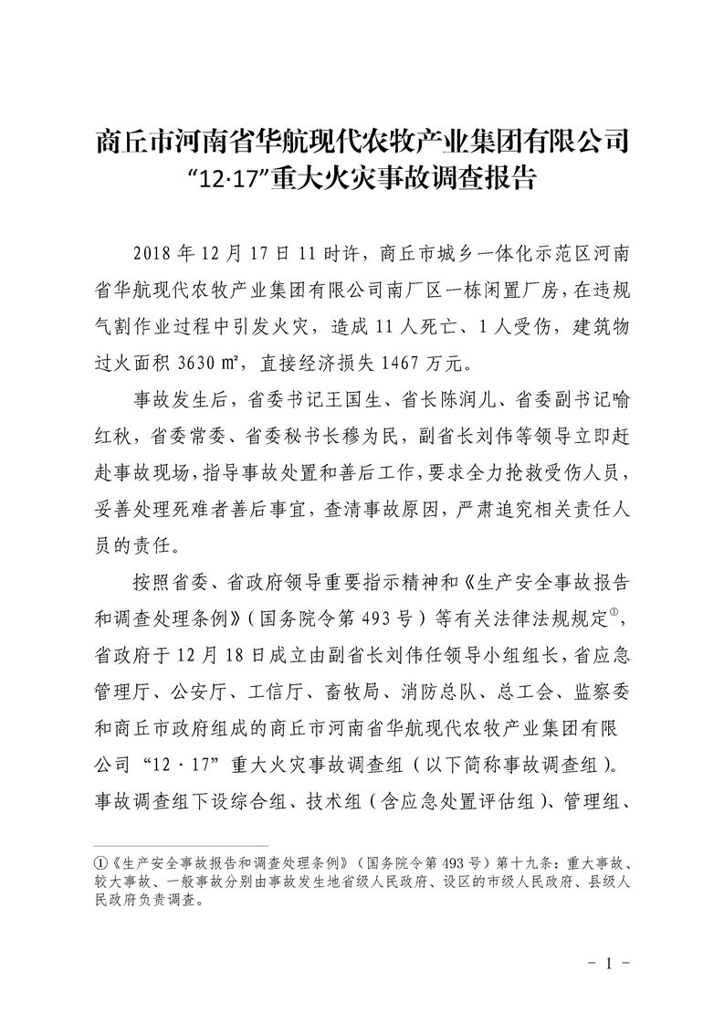 2019年4月28日,河南省應(yīng)急管理廳官網(wǎng)公布《商丘市河南省華航現(xiàn)代農(nóng)牧產(chǎn)業(yè)集團(tuán)有限公司“12·17”重大火災(zāi)事故調(diào)查報(bào)告》。報(bào)告全文如下: