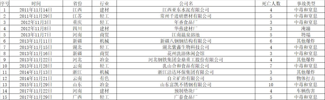 2011年至2017年的11月份,工貿(mào)行業(yè)共發(fā)生較大及以上事故15起、死亡71人,中毒和窒息事故共8起、死亡41人,事故起數(shù)和死亡人數(shù)分別占53%和57%;特別是2015年11月29日,山東富凱不銹鋼有限公司發(fā)生1起死亡10人的中毒和窒息的重大事故。