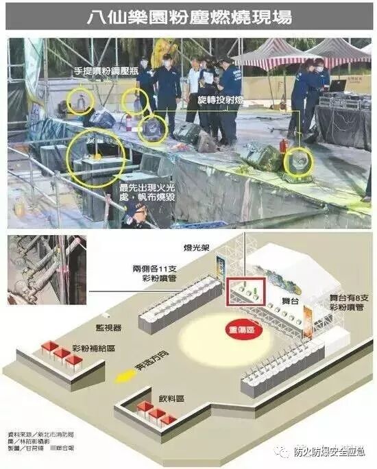 2015年6月27日晚8時30分左右,臺新北市八仙水上樂園正舉辦一場類似嘉年華的“彩色派對”,大約4500名年輕男女穿著泳衣,隨著音樂忘情舞動。工作人員噴灑大量彩色粉末,并配合泡沫營造歡樂氣氛。突然間,舞臺左方的泡沫機(jī)噴射口起火,旋及沿著彌漫舞池的粉塵燃燒,產(chǎn)生連鎖爆燃。