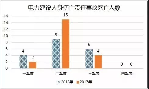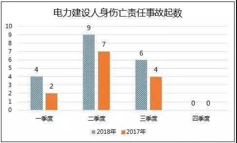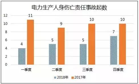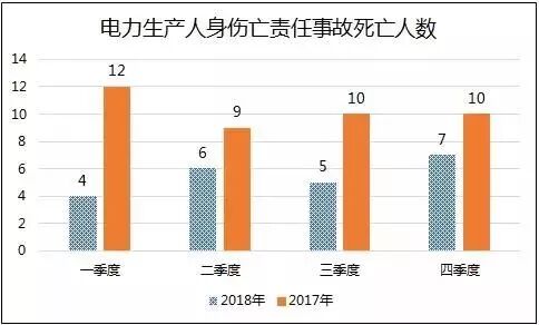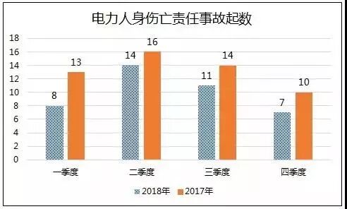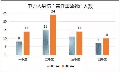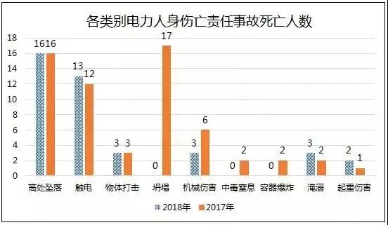 2018年,高處墜落事故死亡16人,觸電事故死亡13人,分別占死亡人數(shù)的40%和32.5%,是電力事故的主要類別。與2017年相比,坍塌、機(jī)械傷害、中毒窒息、容器爆炸等類事故死亡人數(shù)大幅下降,觸電、淹溺和起重傷害3類事故同比增加,需各企業(yè)認(rèn)真采取措施應(yīng)對防范。