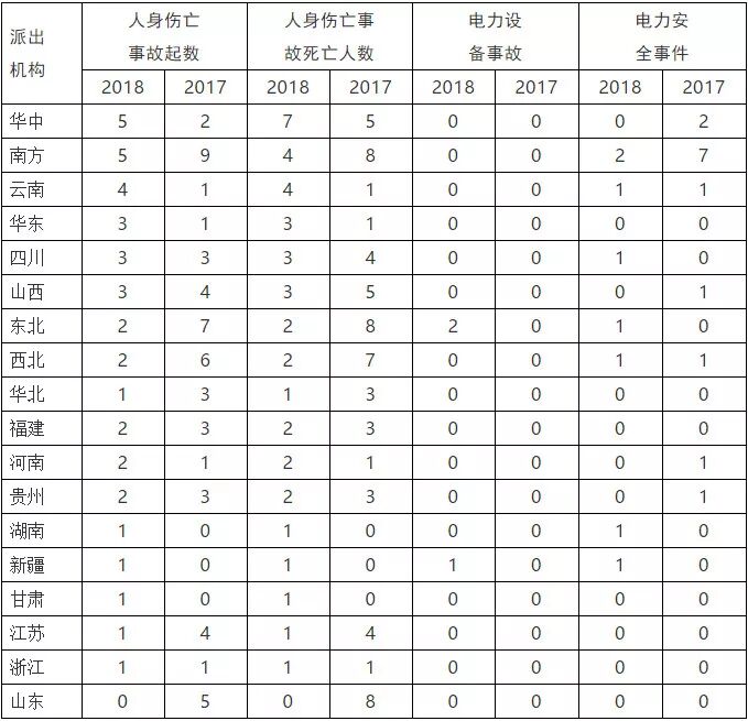 2018年,18家派出能源監(jiān)管機(jī)構(gòu)中有17家發(fā)生電力人身傷亡責(zé)任事故,山東區(qū)域未發(fā)生任何電力事故。下表是按監(jiān)管區(qū)域?qū)ω?zé)任事故進(jìn)行了劃分,華中、云南、華東、河南、湖南、新疆、甘肅等7個區(qū)域電力人身傷亡事故起數(shù)較2017年同比上升,南方、山西、東北、西北、華北、福建、貴州、江蘇、山東等9個區(qū)域電力人身傷亡事故起數(shù)較2017年同比下降,其余2個區(qū)域事故起數(shù)同2017年持平。