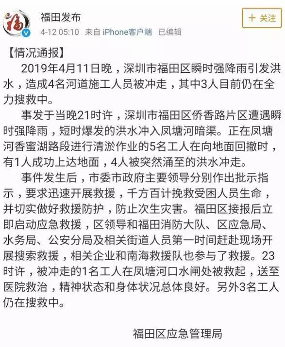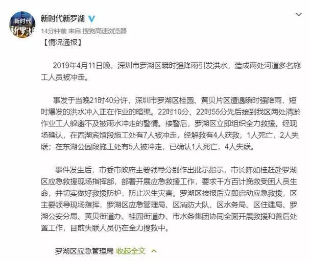 另據(jù)中共深圳市羅湖區(qū)委宣傳部官方微博@新時(shí)代新羅湖,2019年4月11日晚,深圳市羅湖區(qū)瞬時(shí)強(qiáng)降雨引發(fā)洪水,造成兩處河道多名施工人員被沖走。