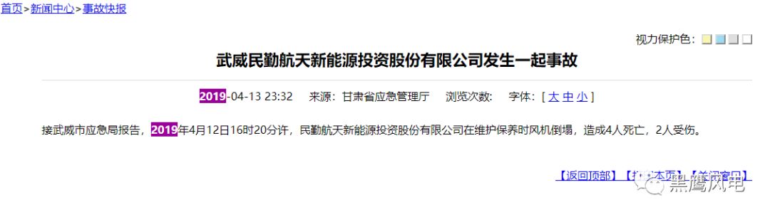 事故 8 ——周家井風電場塔筒倒塌。2019年4月12日下午3時左右,甘肅民勤周家井風電場在進行風機定檢工作時,一臺風機塔筒倒塌,風機上6名檢修工作人員跌落,致4人死亡,1人重傷,1人輕傷。