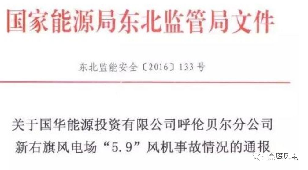 事故 3 ——國華能投呼倫貝爾分公司新右旗風電場“5˙9”風機事故。國家能源局東北監(jiān)管局通報,2016年5月10日,神華國華(呼倫貝爾)風電有限公司35202號風電機組(型號DF70B)發(fā)生著火事故。國家能源局東北監(jiān)管局通報國華能源投資呼倫貝爾分公司新右旗風電場“5˙9”風機事故情況,并對風電企業(yè)提出了三點工作意見。