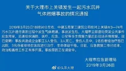 通報(bào)原文如下:2019年3月23日18時(shí)50分左右,中建五局第三建筑公司在對(duì)上關(guān)鎮(zhèn)W3-74號(hào)污水沉井進(jìn)行清淤過程中發(fā)生氣體燃爆。事故發(fā)生后,大理市立即啟動(dòng)突發(fā)公共事件應(yīng)急預(yù)案,迅速組織消防、醫(yī)療、應(yīng)急、公安等多支救援力量趕赴現(xiàn)場(chǎng)開展救援。