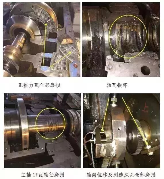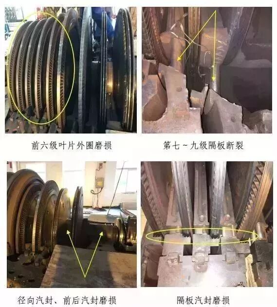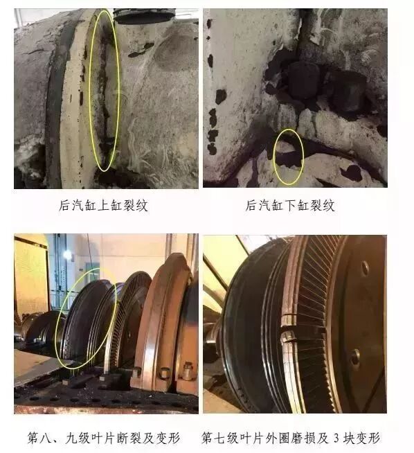 經(jīng)檢查,汽輪機后缸上、下缸體開裂,第八、九級葉片全部脫落,第七級葉片外圈磨損及3塊變形,前六級葉片外圈磨損,第七~九級隔板斷裂,隔板汽封、徑向汽封、前后汽封全部磨損,主油泵小軸斷裂及油封環(huán)磨損,主油泵擋油環(huán)斷裂,正推力瓦全部磨損,1#~4#瓦損壞,主軸1#、2#瓦軸徑磨損,軸向位移及測速探頭全部磨損,汽輪機側(cè)聯(lián)軸器及齒輪位移,盤車電機殼體斷裂,勵磁機定轉(zhuǎn)子摩擦損壞,整流盤連接線斷裂及風扇葉片磨損,凝汽器約20根銅管受損,發(fā)電機轉(zhuǎn)子需返廠檢修測試。