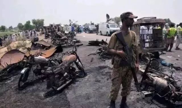 2017年6月25日晨,1輛裝運25立方米汽油的油罐車從巴基斯坦卡拉奇出發(fā)準(zhǔn)備前往拉合爾途中,因1只輪胎爆胎而失控側(cè)翻,罐體受損引發(fā)汽油泄漏。附近村民不顧警告,聞訊蜂擁而至哄搶泄漏汽油。事發(fā)約45分鐘后,泄漏汽油突然起火爆炸,村民被巨大火球吞沒。事故至少造成了154人死亡(包括20名兒童),超過200人受傷。