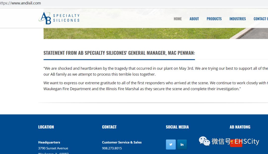 爆炸地點是名叫AB Specialty Silicones工廠,位于芝加哥市以北約40英里處,該工廠24小時工作,主要生產(chǎn)有機硅化工品。當?shù)貢r間周五晚9點半發(fā)生爆炸,爆炸時有9名工人在內(nèi)。