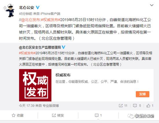 2019年5月25日15時(shí)15分許,白峰街道北海燃料化工公司一油罐著火,區(qū)領(lǐng)導(dǎo)及相關(guān)部門緊急趕赴現(xiàn)場(chǎng)指揮處置。目前著火儲(chǔ)罐明火已被撲滅,現(xiàn)場(chǎng)兩名人員暫時(shí)失聯(lián)。具體著火原因正在核查中。