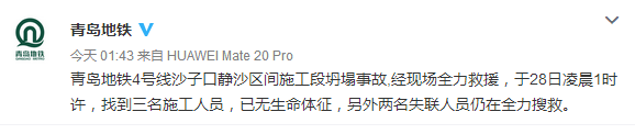 今天凌晨,@青島地鐵 消息稱,經(jīng)現(xiàn)場(chǎng)全力救援,于28日凌晨1時(shí)許,找到三名施工人員,已無(wú)生命體征,另外兩名失聯(lián)人員仍在全力搜救。