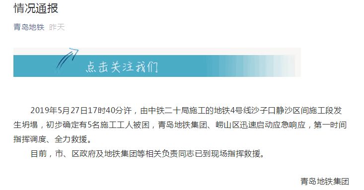 青島地鐵集團(tuán)通報(bào),2019年5月27日下午17時(shí)40分許,由中鐵二十局施工的地鐵4號(hào)線沙子口靜沙區(qū)間施工段發(fā)生坍塌,初步確定有5名施工工人被困。