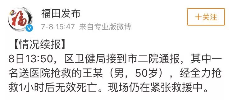 15時(shí)47分,福田發(fā)布發(fā)布續(xù)報(bào)稱:8日13:50,區(qū)衛(wèi)健局接到市二院通報(bào),其中一名送醫(yī)院搶救的王某(男,50歲),經(jīng)全力搶救1小時(shí)后無(wú)效死亡。現(xiàn)場(chǎng)仍在緊張救援中。