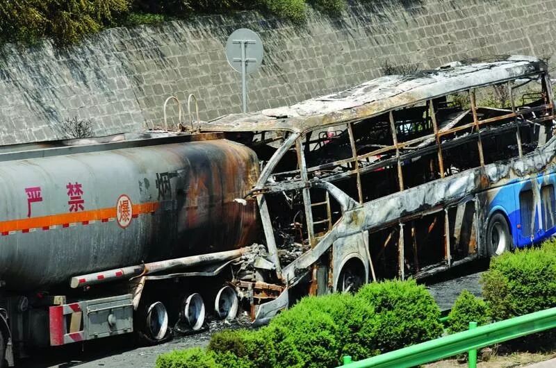2012年8月26日2時(shí)31分許,包茂高速公路陜西省延安市境內(nèi)發(fā)生一起特別重大道路交通事故,造成36人死亡、3人受傷,直接經(jīng)濟(jì)損失3160.6萬(wàn)元。事故原因是:裝載35.22噸甲醇的重型半掛貨車(chē)從匝道違法駛?cè)敫咚俟?,在高速公路上違法低速行駛;臥鋪大客車(chē)遇重型半掛貨車(chē)從匝道駛?cè)敫咚俟窌r(shí),本應(yīng)能夠采取安全措施避免事故發(fā)生,但因疲勞駕駛而未采取安全措施,正面追尾碰撞重型半掛貨車(chē)。碰撞致使臥鋪大客車(chē)前部與重型半掛貨車(chē)罐體尾部鉸合,大客車(chē)右側(cè)縱梁撞擊罐體后部卸料管,造成卸料管豎向球閥外殼破碎,導(dǎo)致大量甲醇泄漏。碰撞也造成臥鋪大客車(chē)電氣線路絕緣破損發(fā)生短路,產(chǎn)生的火花使甲醇蒸氣和空氣形成的爆炸性混合氣體發(fā)生爆燃起火,大火迅速引燃重型半掛貨車(chē)后部和臥鋪大客車(chē),并沿甲醇泄漏方向蔓延至附近高速公路路面和涵洞。