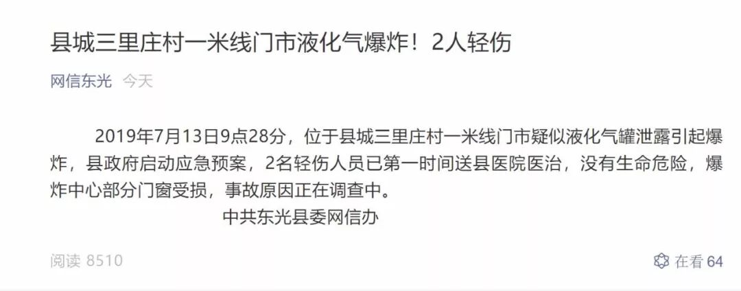 13日12點,據(jù)河北省滄州市東光縣網(wǎng)信辦通報,7月13日9點28分,位于縣城三里莊村一米線門市疑似液化氣罐泄露引起爆炸,縣政府啟動應(yīng)急預(yù)案,2名輕傷人員已第一時間送縣醫(yī)院醫(yī)治,沒有生命危險,爆炸中心部分門窗受損,事故原因正在調(diào)查中。