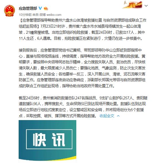 新京報快訊 據(jù)應(yīng)急管理部微博消息,7月23日21時許,貴州省六盤水市水城縣雞場鎮(zhèn)發(fā)生一起山體滑坡,21幢房屋被埋。當?shù)亓⒓唇M織搶險救援,截至24日6時,已救出17人,其中11人生還,6人遇難。目前,搶險救援正在緊張進行,災(zāi)情仍在進一步核查中。